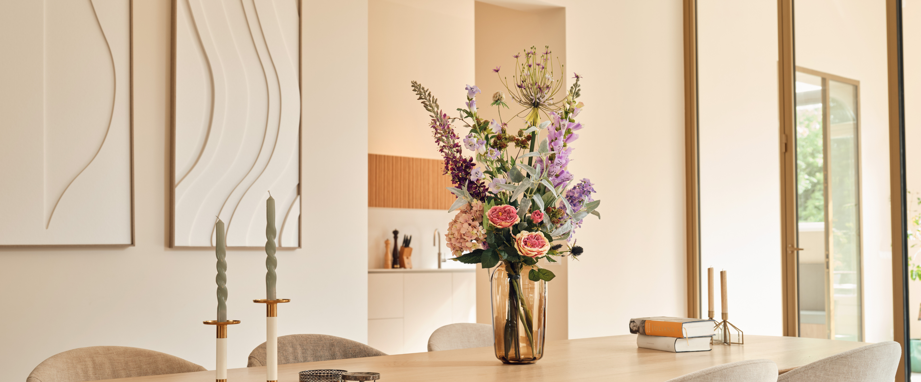 Ontdek onze collectie paarse kunstbloemen boeketten: luxe zijden bloemarrangementen die mystiek en elegantie combineren. Van zachte lavendeltinten tot diepe paarse accenten – perfect voor een koninklijke uitstraling in huis of kantoor. Whether you are looking for a silk field bouquet , silk tulips , a large artificial bouquet or a small artificial bouquet . At Blooming Good you will always find a silk bouquet that suits you!